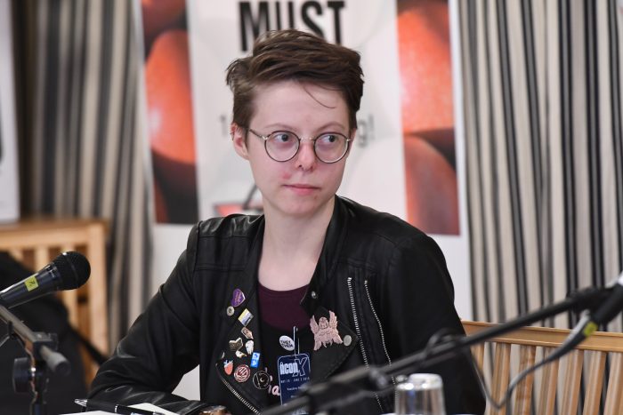 När eftermiddagen nosar på kväll skall Amal, Nahal, Frida Otterhag och Sanna Bo Claumarch tala tecknade serier. Det är inte riktigt mitt område: jag har knappt tid att titta på rörliga bilder över huvud taget och har svårt för barn- och ungdomskultur även när den försöker bredda sig för att tilltala en vuxen publik. Men potentialen för att lära sig mest finns förstås när man lyssnar på det man vet minst om. Framför allt har jag en kamera och i panelen sitter Sanna. Hon är en fröjd att fotografera. Det är fint med människor som har ett minspel.