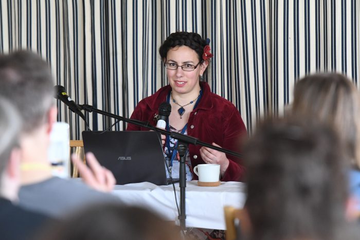 Amal håller hedersgästtal. Det handlar mycket om hennes farmorsmor. Eller farfarsmor. Engelskan är ett språk utan precision. En svensk släkting. Om kardemumma, om flykt och att vara en gäst någonstans. Det är ett fint sätt att skapa koppling till publiken – även om inte alla delar av den nödvändigtvis känner sig kopplade till Sverige och Stockholm – och sedan glida in i att vara gäst och värd i litteraturen och vad det innebär att vara vänlig nog att bjuda in läsaren. Sedan läsning: This Is How You Lose the Time War som Amal skrivit tillsammans med Max Gladstone. Den verkar lite rolig om man uppskattar brevromaner, och vem uppskattar inte brevromaner? Det skrivs inte bara för få brev nu för tiden. Det skrivs också för lite brevlitteratur. Men det är bok att läsas, inte lyssnas på. Jag går igenom bilder på kameran och rensar. Fotar. Inser ett efter tag att jag har slutat lyssna. Det blir så när människor högläser tystläsningslitteratur.